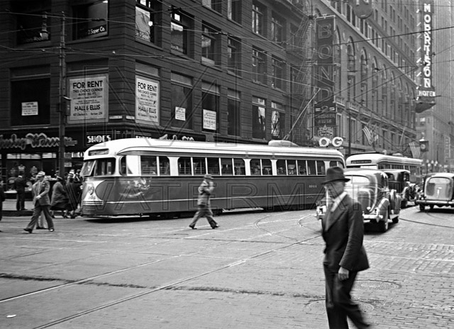 Chicago Surface Line PCC 4044 “Green Hornet” at the corner of Washington and Dearborn. June 3, 1941.