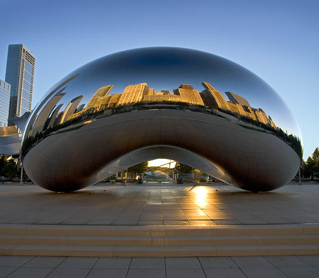This stainless steel Chicago sculpture is located in Millennium Park. Created by Anish Kapoor it is often referred to as "The Bean”. Photographing it backlit at sunrise emphasizes the iconic Chicago skyline.